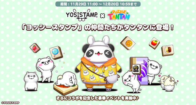 LINE パズル タンタン コラボ 2024年12月02日 【LINE パズル タンタン】『ヨッシースタンプ』とコラボレーション! 2角取りパズルゲーム「LINE パズル タンタン」が、『ヨッシースタンプ』とコラボレーションを開始!限定キャラクターやコスチュームが登場するので、ぜひ楽しんでくださいね♪【期間】2024年11月29日(金)11:00~12月20日(金)10:59まで※イベントの詳細はゲームのお知らせをご