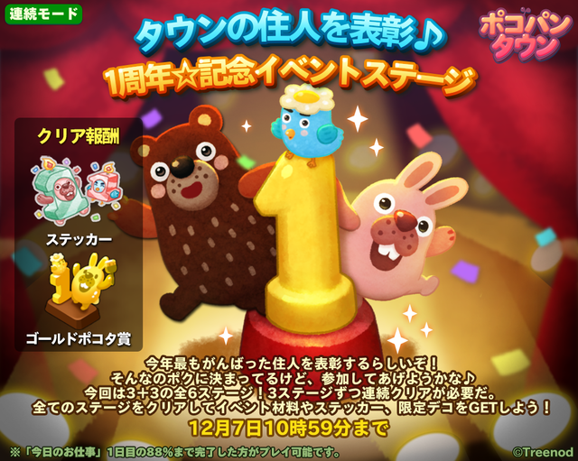 LINE ポコパンタウン キャンペーン 2018年11月30日 【LINE ポコパンタウン】リリース1周年記念イベントステージ開催! 町づくり×1タップパズルゲーム「LINE ポコパンタウン」は、12月13日にリリース1周年を迎えました!皆様へ日頃の感謝を込めた記念イベントを開催します!ぜひ、チェックしてくださいね♪■タウンの住人を表彰♪ 1周年記念イベントステージ開催!リリース1周年を記念したイベ